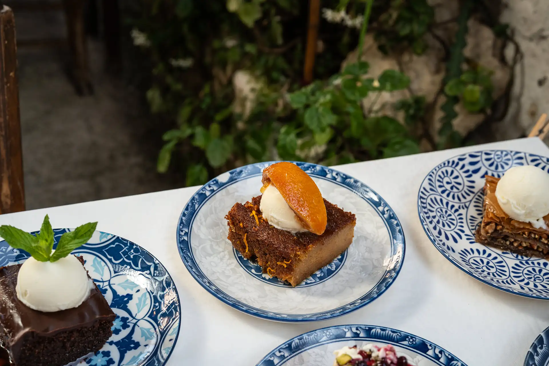 Mixed seasonal leaves, Cyprus carob rusk, walnuts, dried sugary citrus, dried tomatoes, fresh anari (sheep, goat and cow cheese) and vinaigrette dressing.