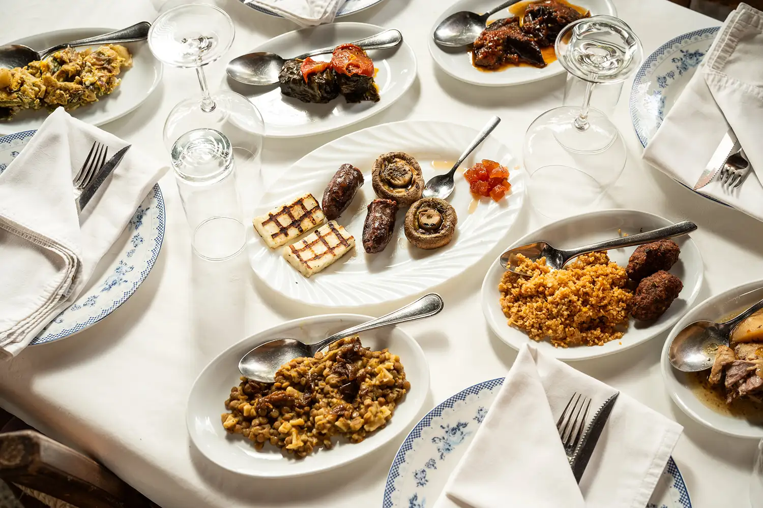 Traditional Cypriot pork mince rolls, served with pourgouri*, vegetables [7], fried potatoes and feta dip [7].